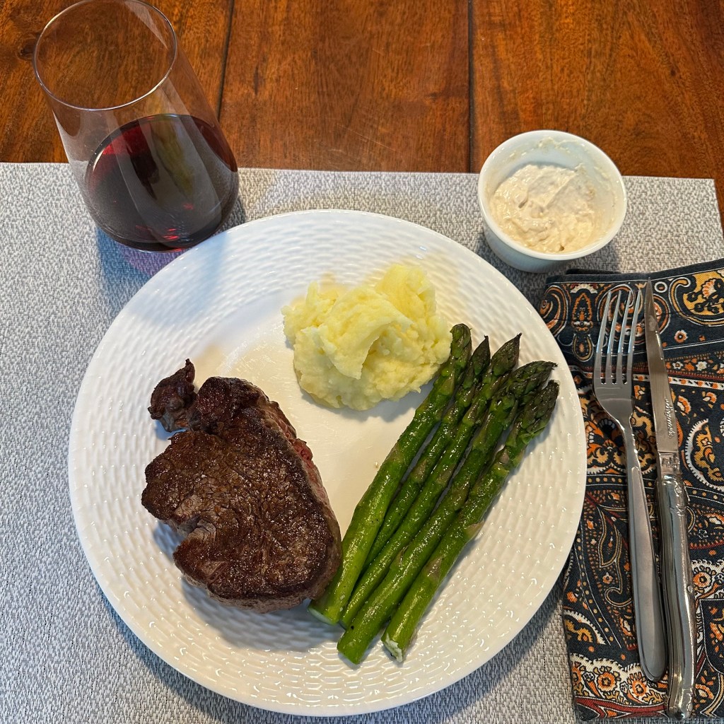 As of this morning I was eight pounds over my goal, but today I did a little better. I had a light lunch and a sensible dinner. Verrill Farm has started to harvest their first batch of asparagus so I got some. I also got filet from Concord Market. And I had a potato so I made a little mashed potato.