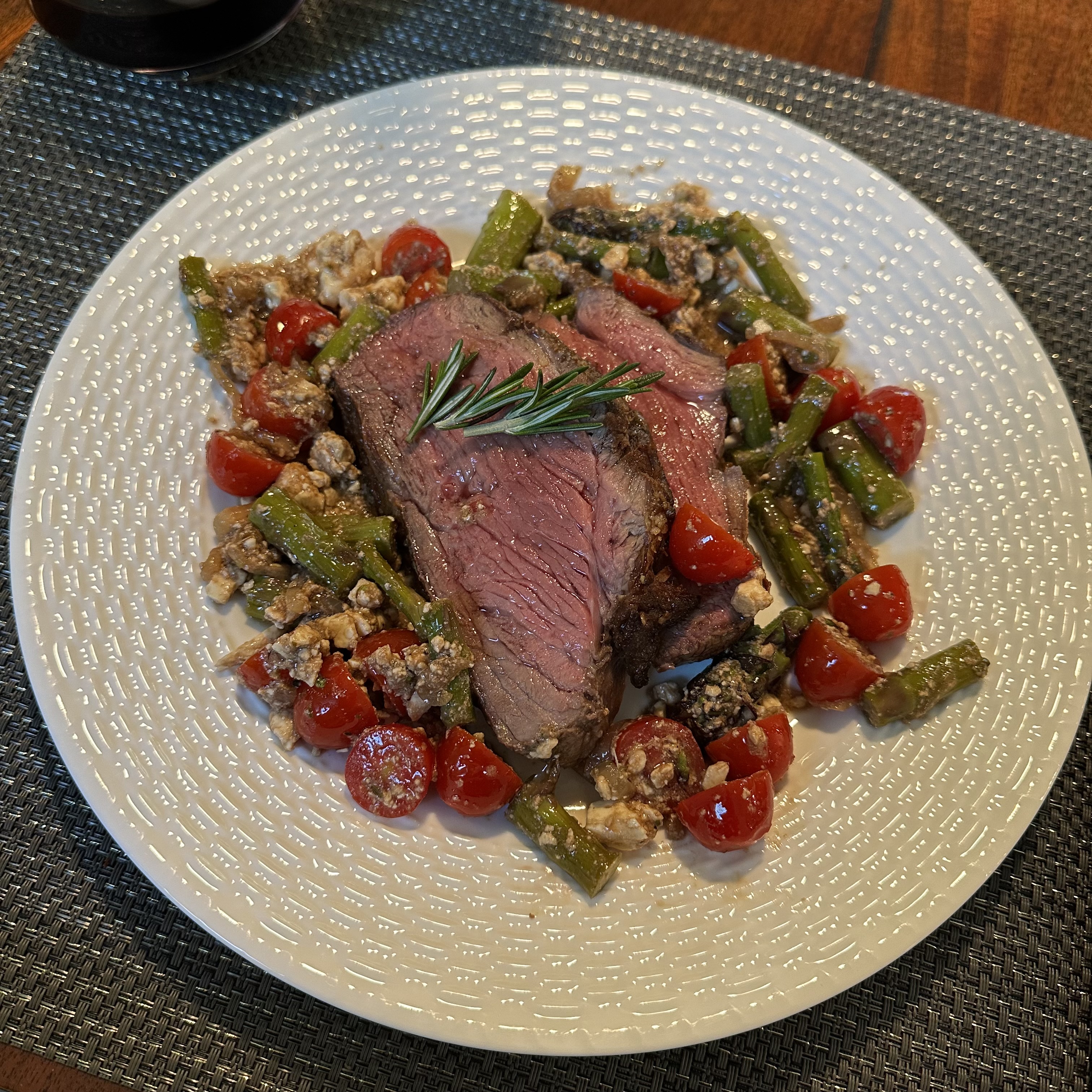 I got a lamb roast at Wilson Farms. It was priced at over $55 but was reduced to $15. That’s a steal. I should have bought more. Tonight I roasted half of it and served it with a tomato-asparagus-feta salad.