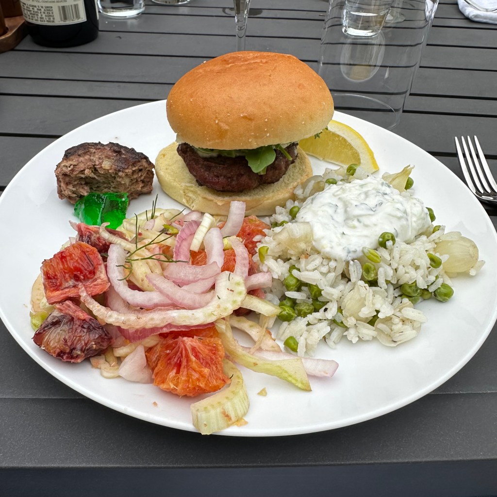 Michael had us over for dinner tonight. He made lamb burgers, fennel-blood orange salad, and rice with tzatziki. We also opened a bottle of Gunpowder Irish Gin.