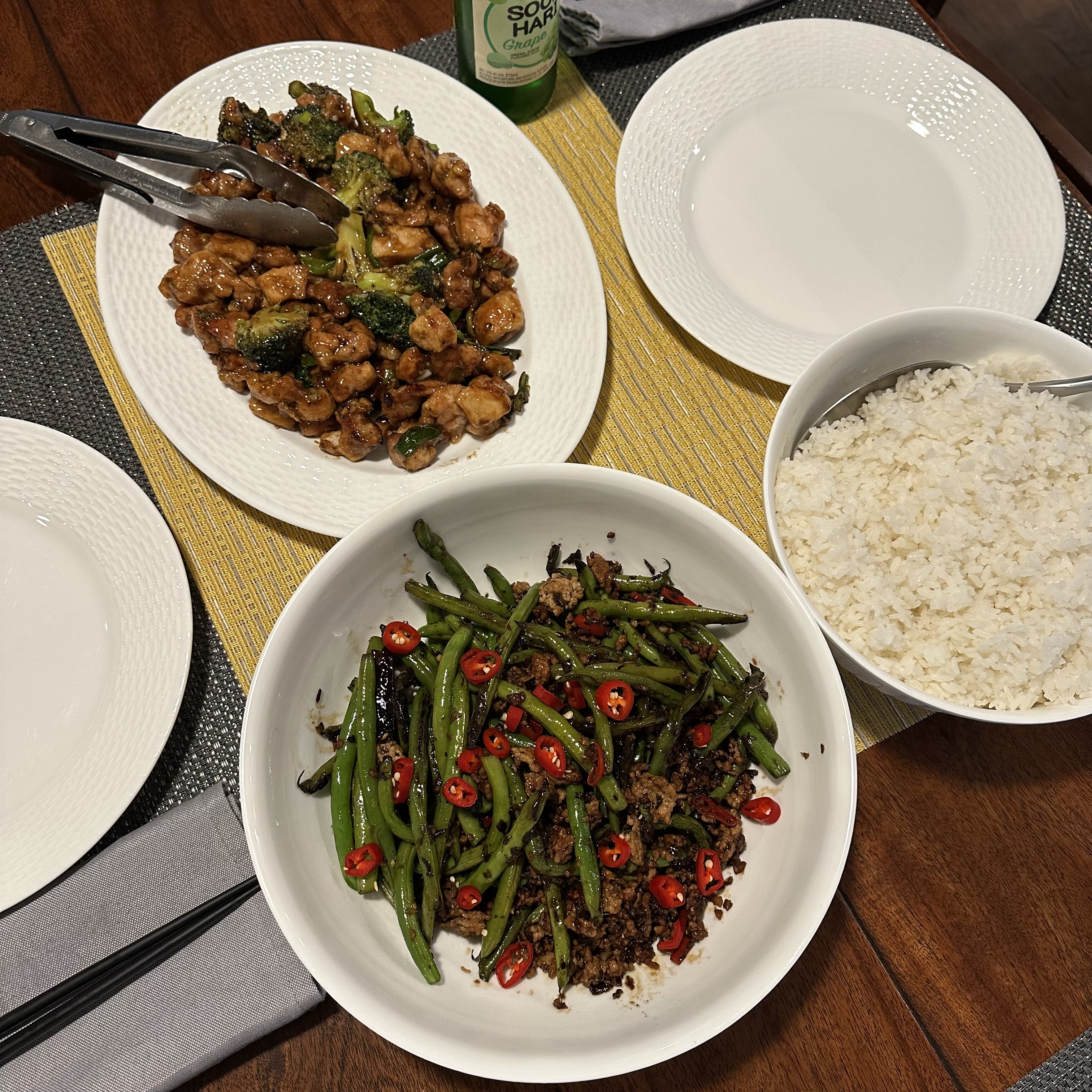 I had Sotheara and Chovry over for dinner. It is always a risk making Asian food for Asians but I think they were impressed. I did green beans with pork, chicken and broccoli, and white rice. I need to work on my brown sauce, but overall it was great.