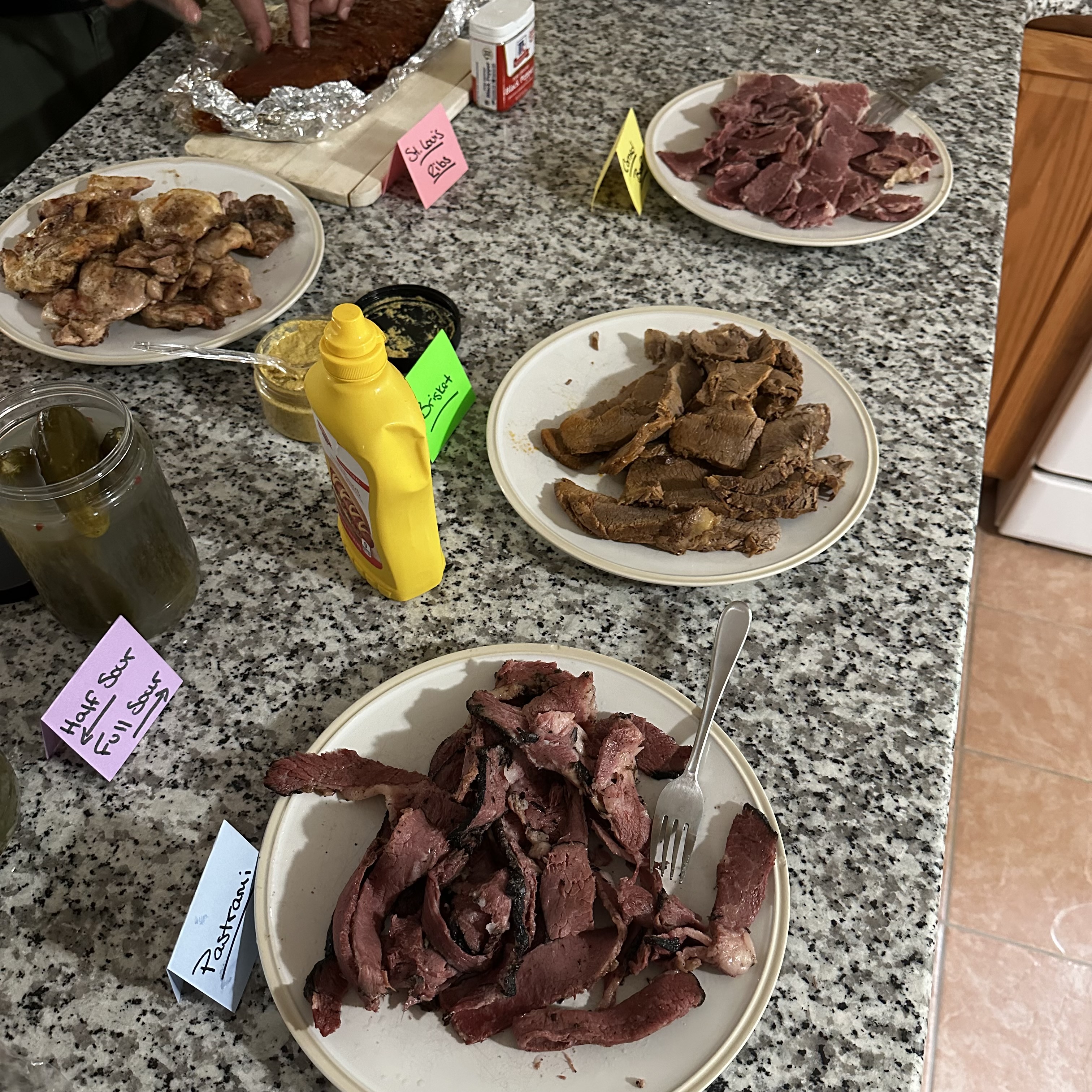 Happy Fathers Day! We first went to Eva’s Little Kitchen for a scone, peaches and cream. It needed a little more peach flavor but the scone itself was very good. Then we went to my in-laws. My wife ordered brisket, pastrami, and corned beef from Katz’s Deli. The best part, however, wasn’t the meat it was the mustard.