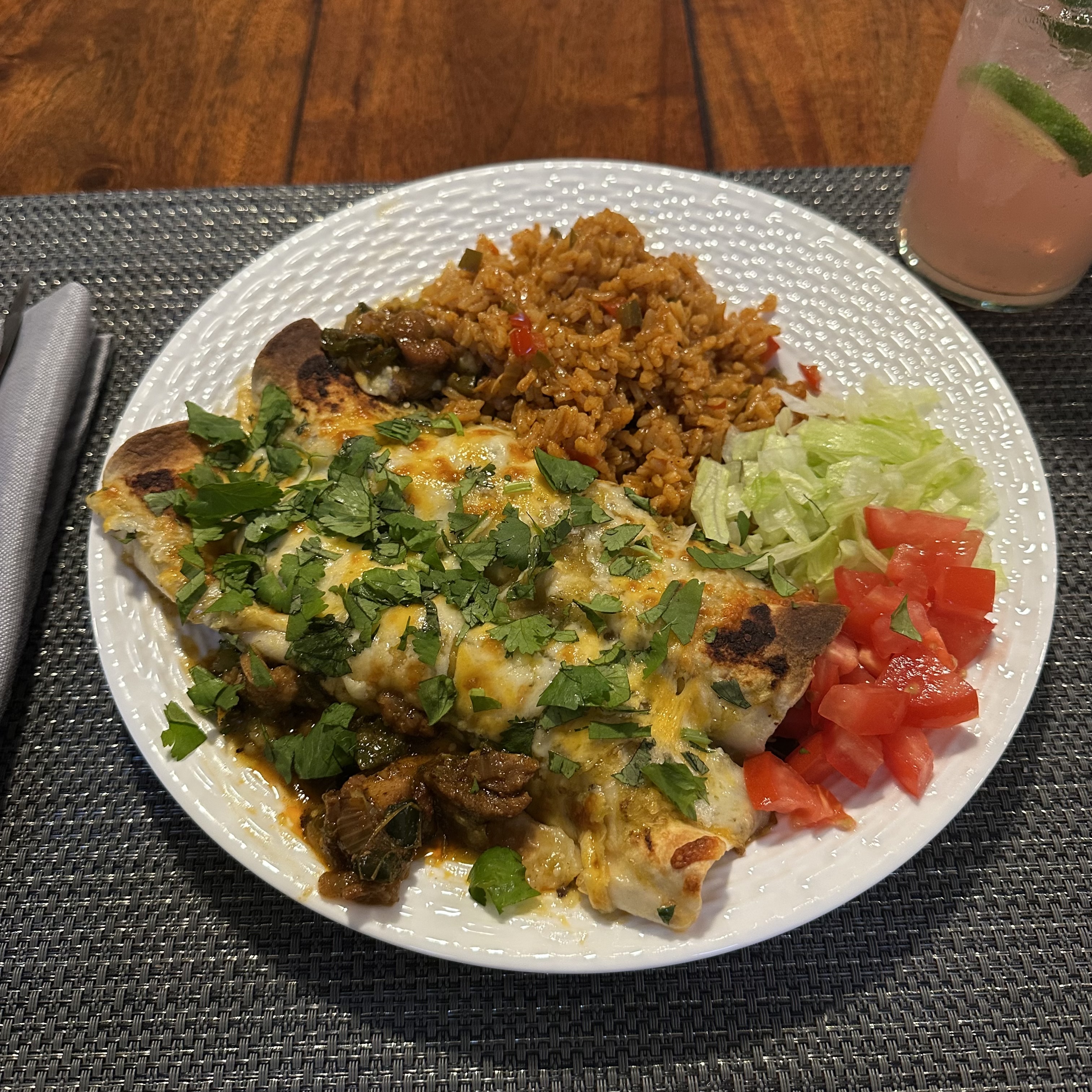 We had a farewell dinner for Georgina and Spencer tonight. Since I made them enchiladas the first time we had them over, I did it again to say good bye. I filled them with my green chili chicken and topped them with tomatillo sauce and cheese. I also made Mexican rice and Kelly served up palomas.