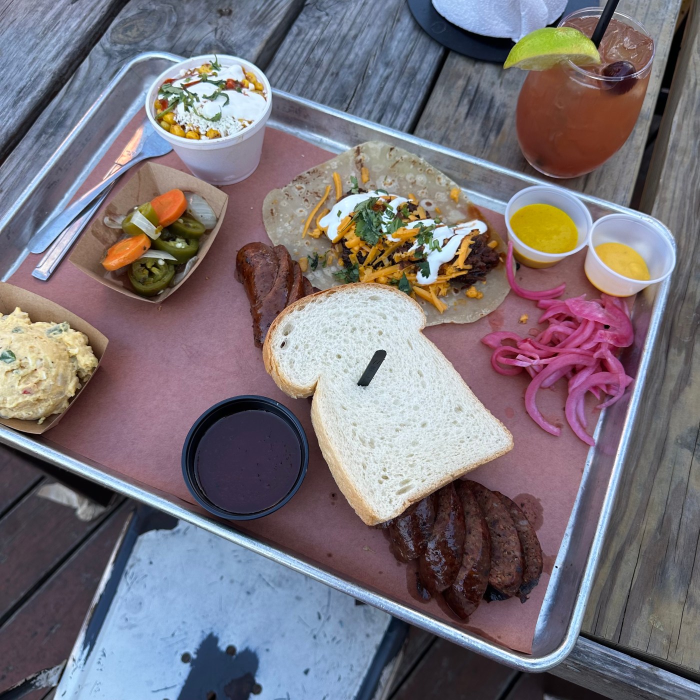 Unlike most of the great Texas barbecue, it’s not necessary to line up early in the morning to eat at The Pit Room. There is bbq even in the late afternoon. While they specialize in brisket, they are known for their breakfast tacos. Those do require an early morning visit. Other menu items include three types of sausage, daytime tacos, and red Texas chili.