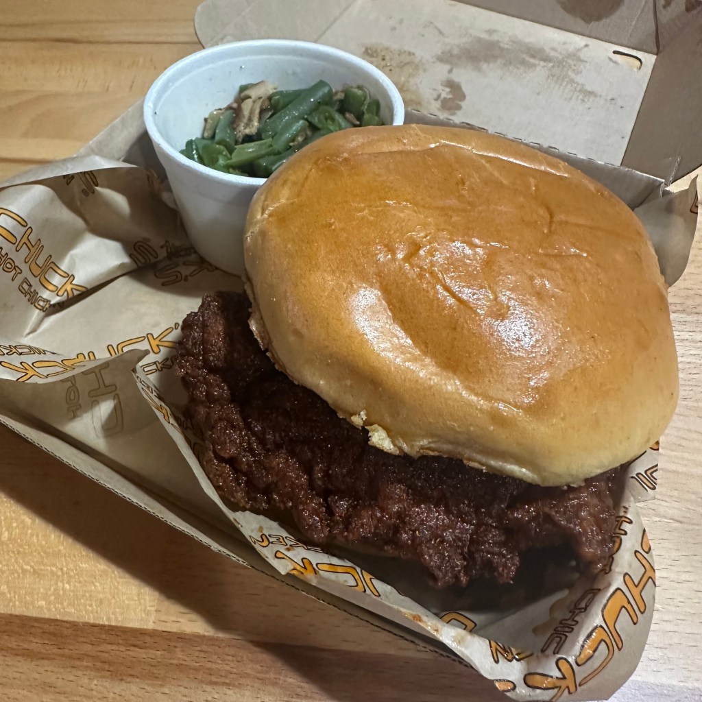 My nephew suggested Chuck’s Hot Chicken to me. It’s a local chain in St. Louis. The sandwich has four basic levels of heat and then two more super hot levels. I went with level four which was very hot and I like hot. I could handle it but my eyes were watering and it gave me the hiccups. It came with a honey mustard bbq sauce that was good. But the real star of the show was the green beans. They were loaded with bacon and onions, almost as good as mine.