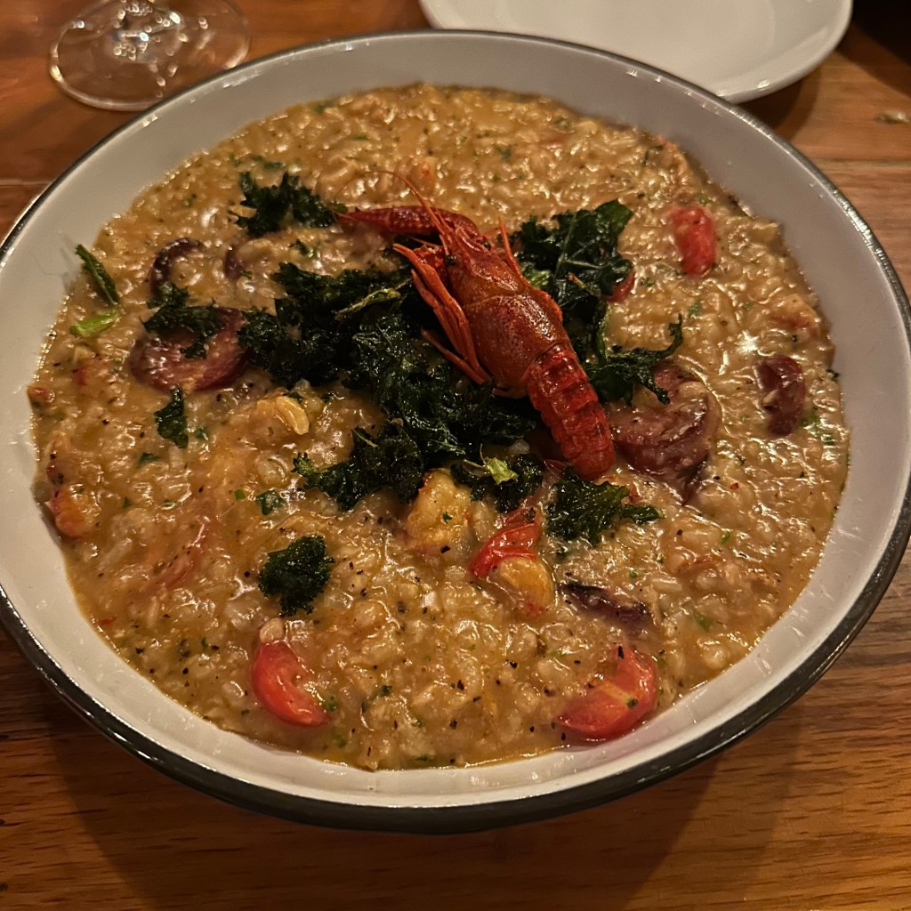 Bayou Risotto at Polite Society: Crawfish Tails, Andouille Sausage, Crispy Kale, Seafood Broth.