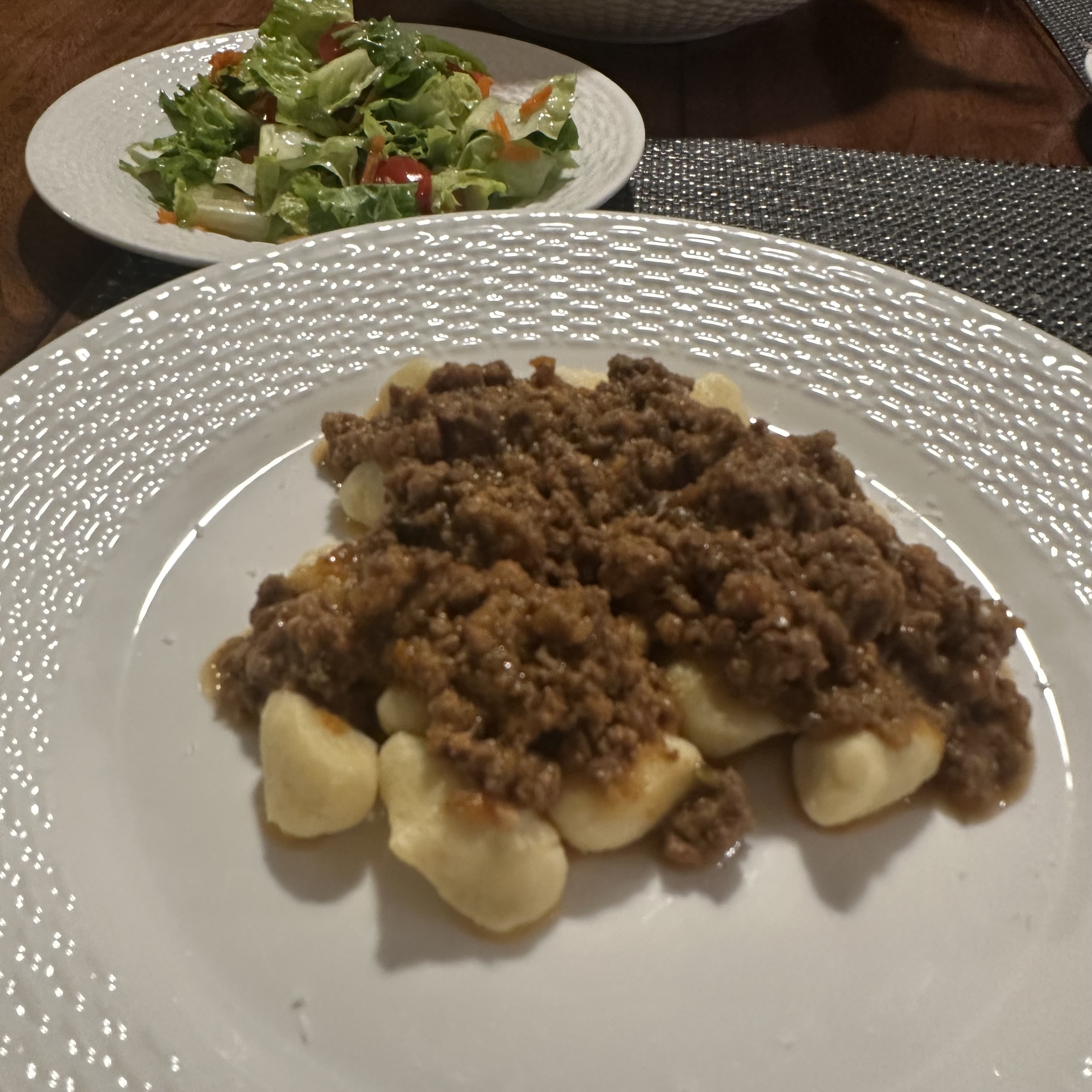 On Saturday I made bolognese with beef and pork. For Sunday supper, I made ricotta gnocchi which I topped it with the sauce. I also made a side salad. Sorry the picture is misfocused.