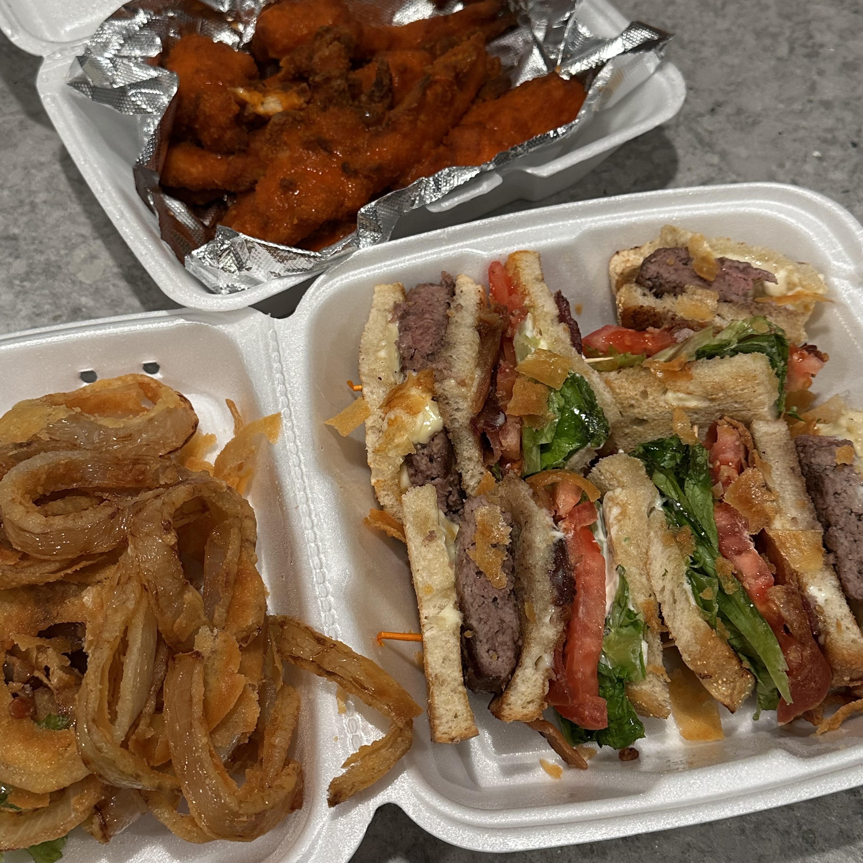 Cheeseburger club, onion rings, and buffalo fingers from Ken’s. Burger was great. Onion rings not as much.