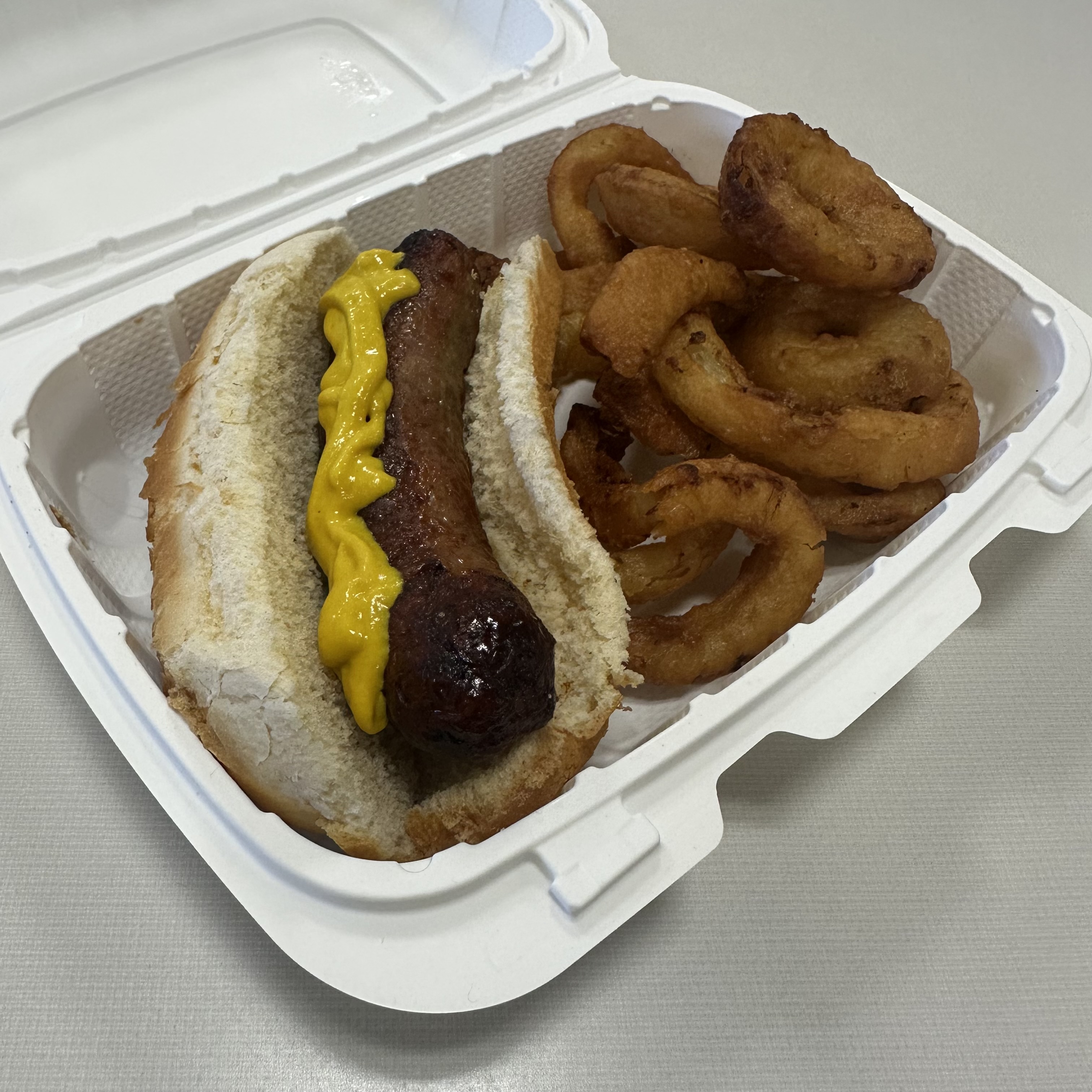 Where can you get a lunch for $5? Mercy Hospital in Creve Coeur, MO. Three bucks for a bratwurst and two more for amazing onion rings. The bun wasn’t great and I wish I could have got better mustard, but for five dollars, you can’t do much better.