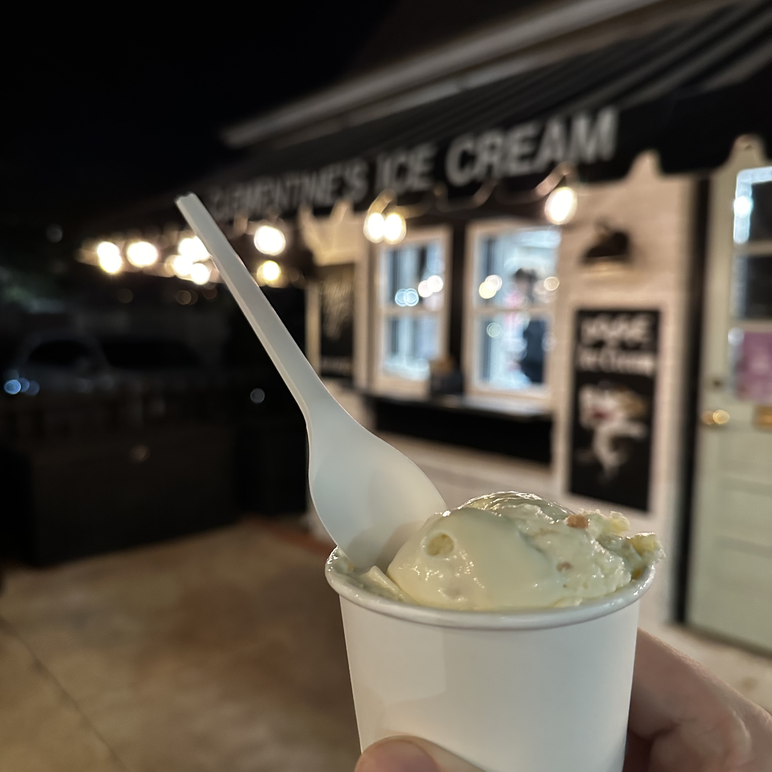 I used to go to this little stand for soft serve as a kid called Jeremiah’s. Today it’s a new place called Clementine’s where I got a little gooey butter ice cream. It was extremely creamy with one really big piece of cake in it.