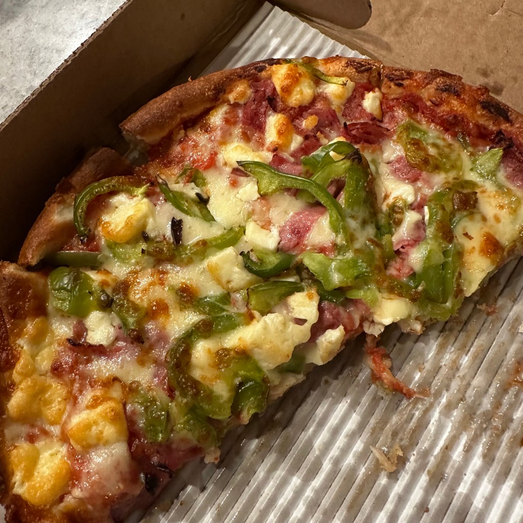Pizza from New London with salami, feta, and green peppers. Try it.