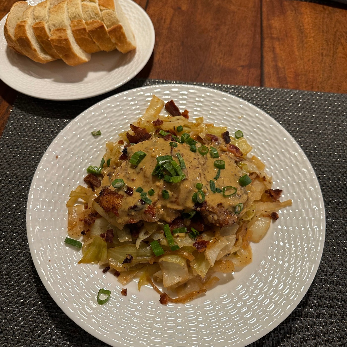 Cabbage braised in apple juice with bacon and onions topped with seared, roasted chicken thigh and creamy mustard sauce, garnished with scallions.