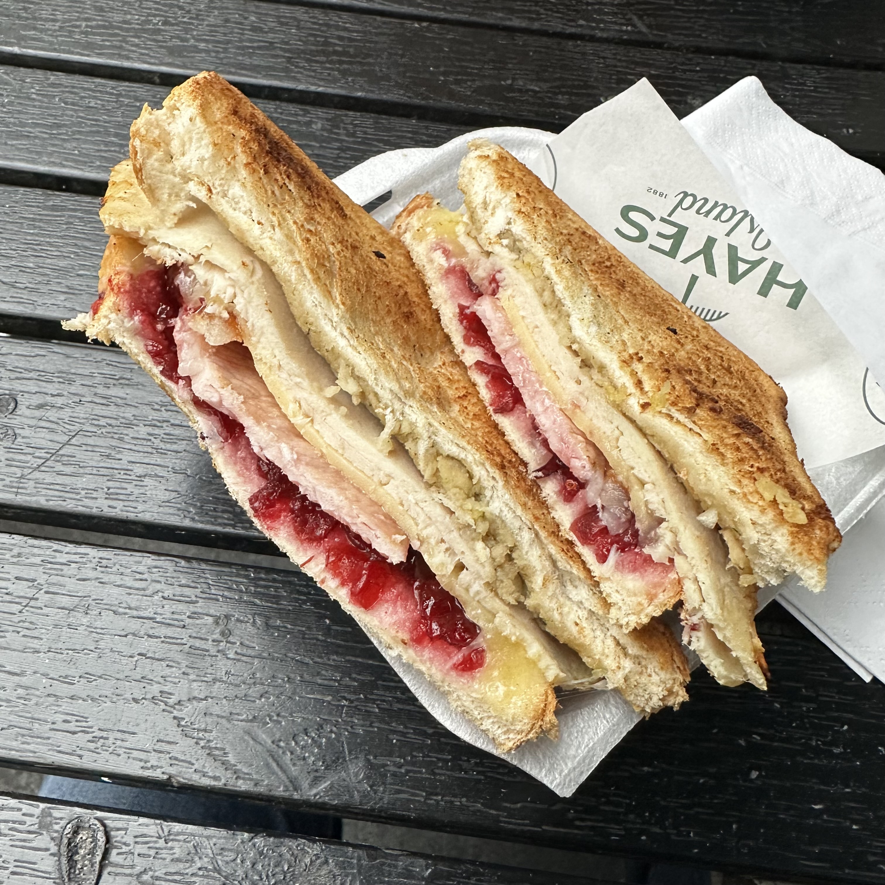 Hayes Snack Bar is the “oldest snack bar in Wales”, whatever that means. We got the Festive Toastie – Turkey, Bacon, Cheese, Stuffing, and Cranberry. Bacon doesn’t mean bacon in Wales. Still a really good sandwich.