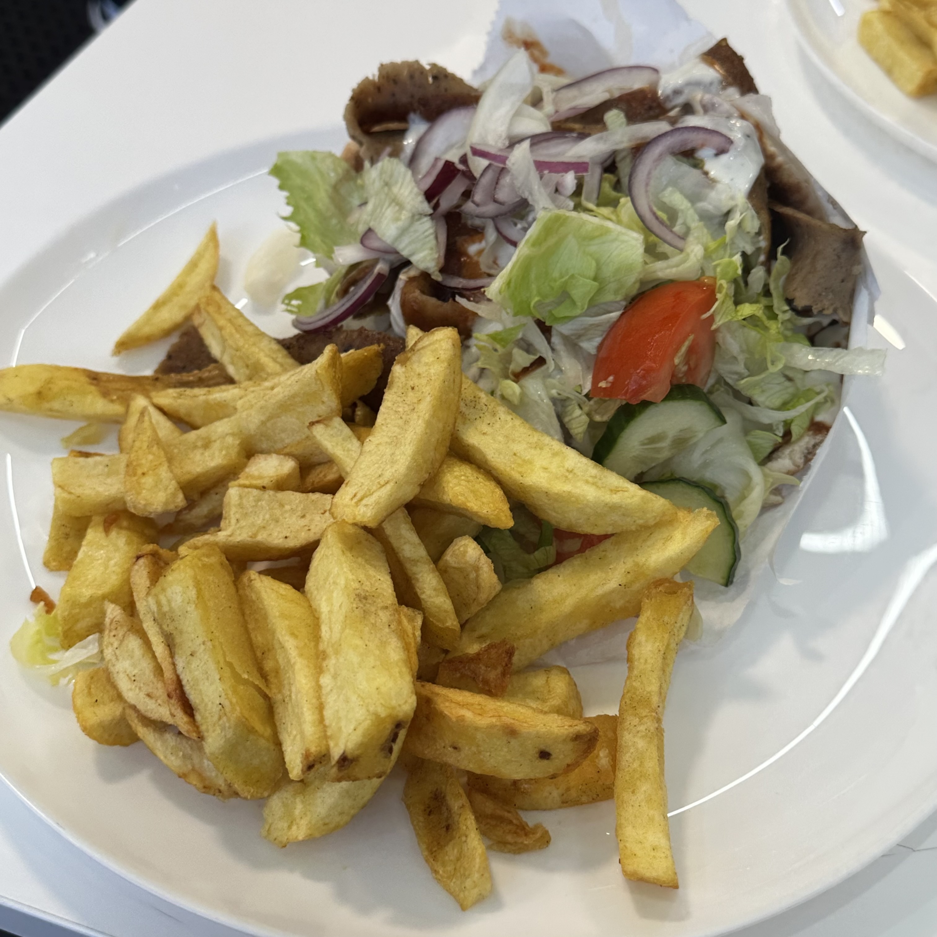 My last meal in the UK, a spicy doner with chips from Hot Spot Fish Bar near Heathrow.
