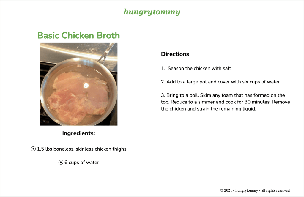 Our stock calls for just three ingredients: chicken, salt, and water. This recipe is so basic, that it can be used anywhere that calls for chicken stock, but you can certainly enhance the flavor by adding additional ingredients. I suggest, black pepper, a bay leaf or two, and some onion, carrot, celery, or garlic.