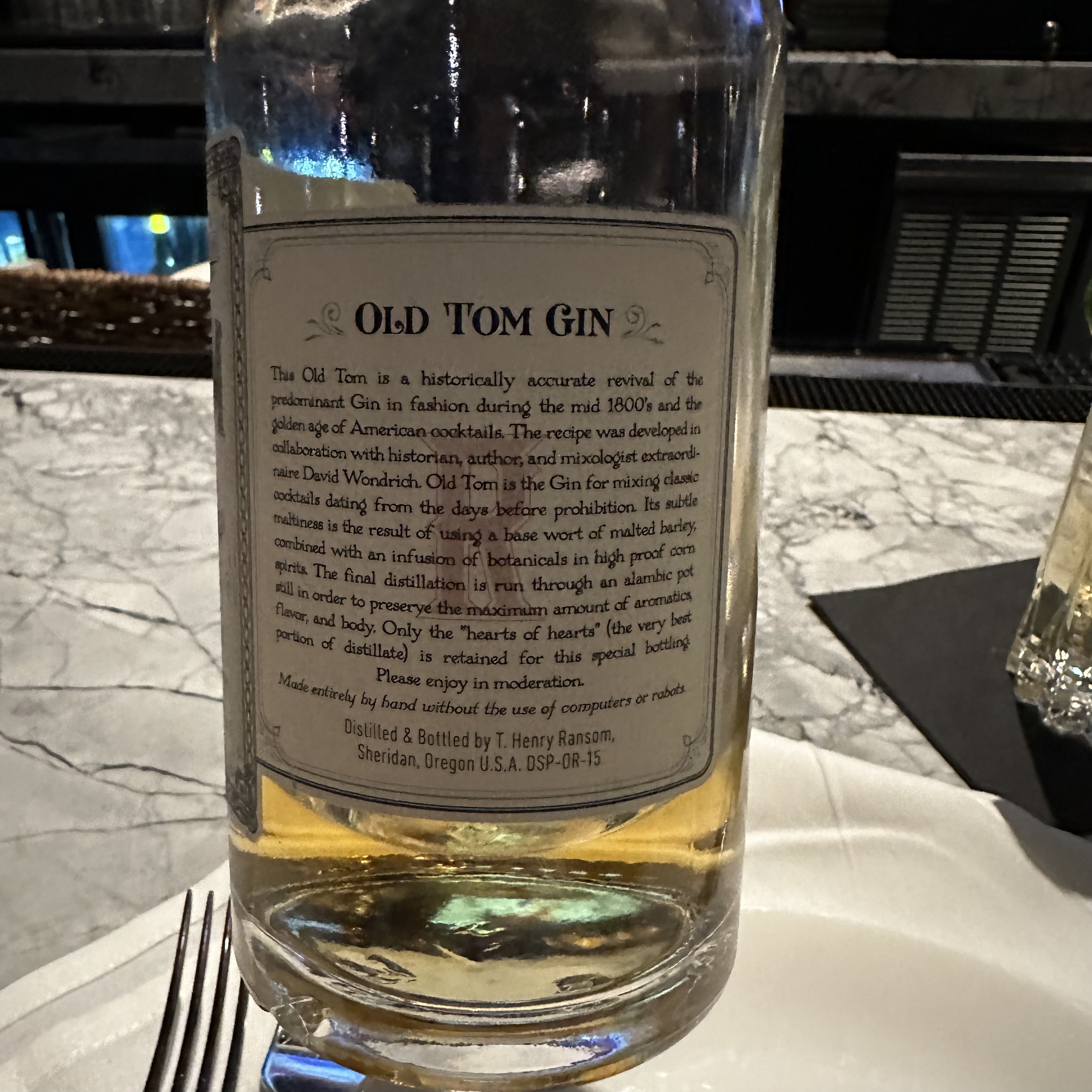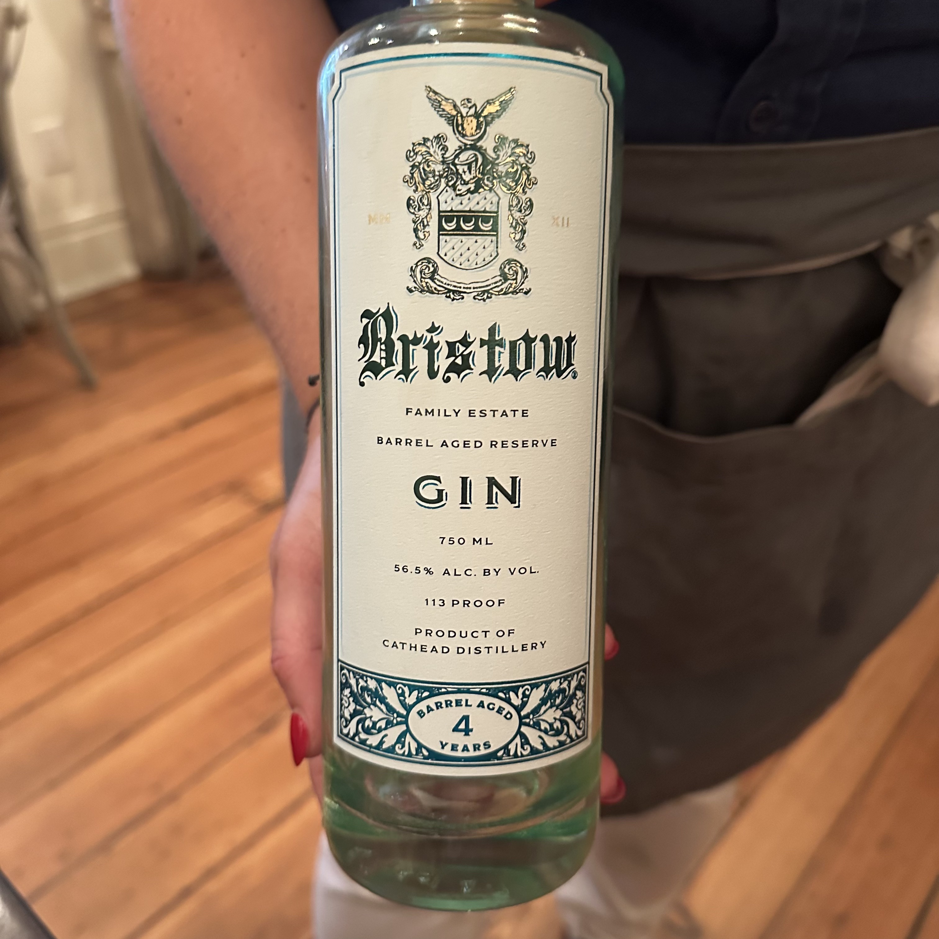 Bristow Barrel Aged Reserve Gin, 4 Year (7.1.24 – Delaney Oyster House, Charleston, SC – photo 1, photo 2)
