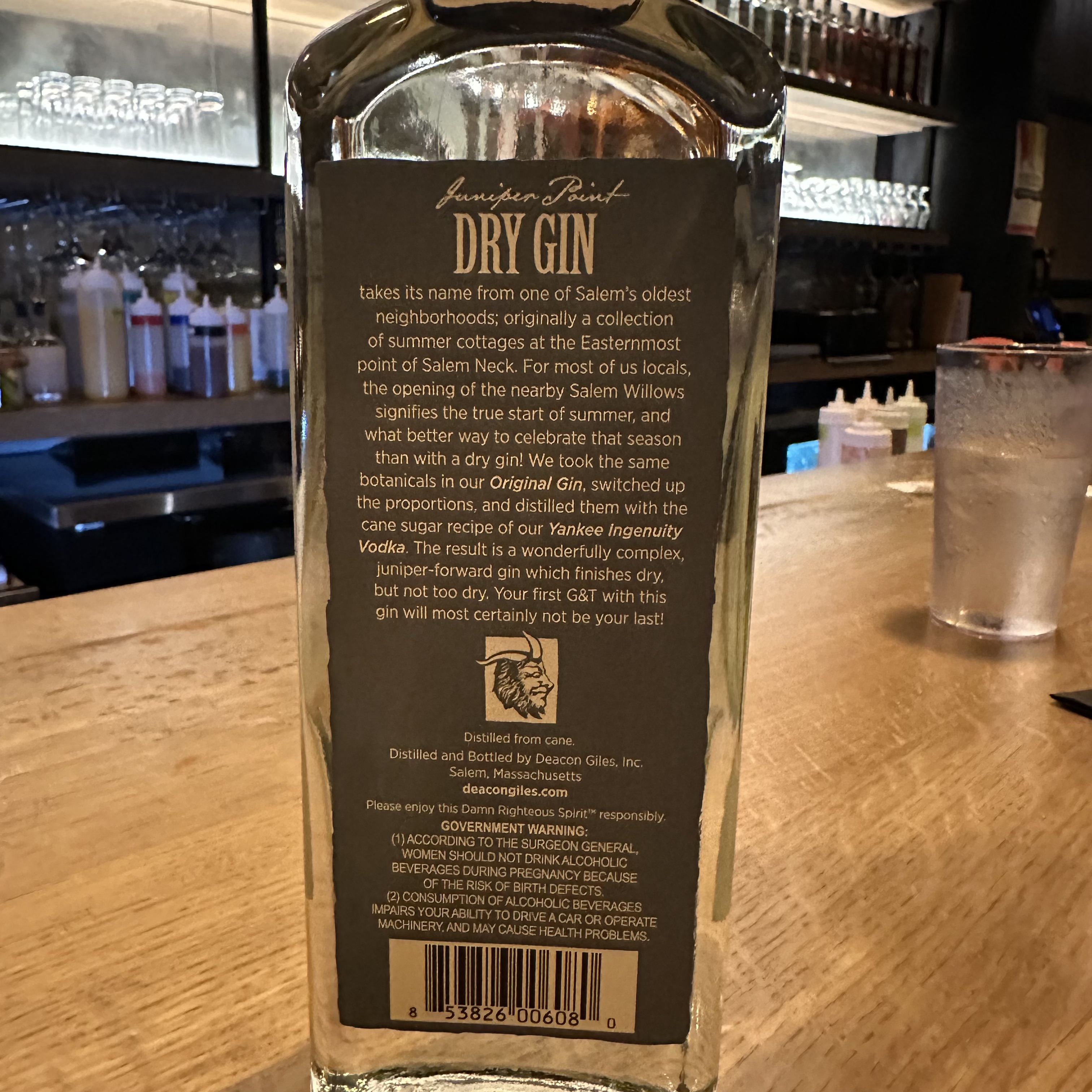 Deacon Giles Juniper Point Dry Gin (6.12.23 – Common Craft, Burlington, MA – photo 1, photo 2)